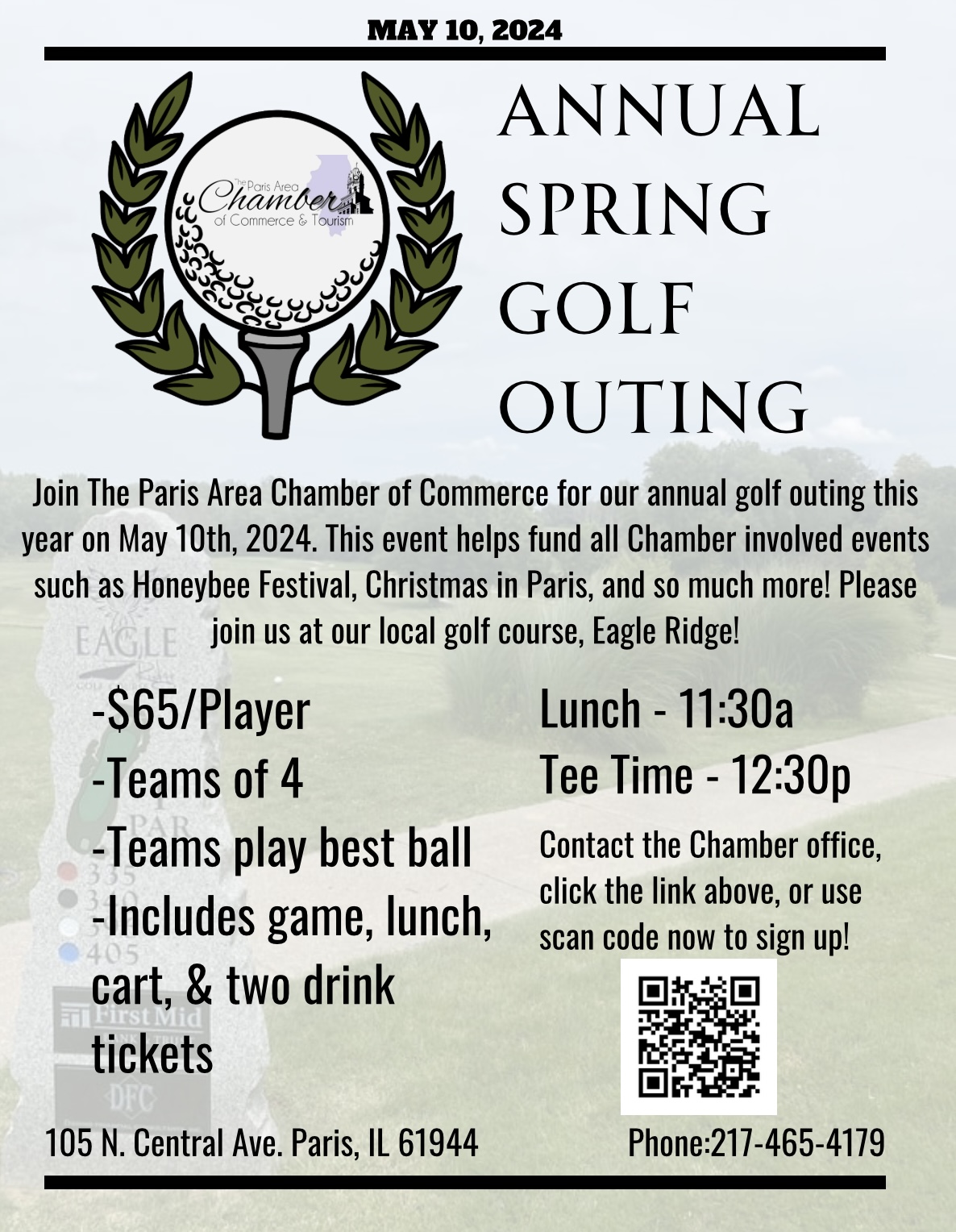 Join The Paris Area Chamber of Commerce for our annual golf outing this year on May 10th, 2024. This event helps fund all Chamber involved events such as Honeybee Festival, Christmas in Paris, and so much more! Please join us at our local golf course, Eagle Ridge!